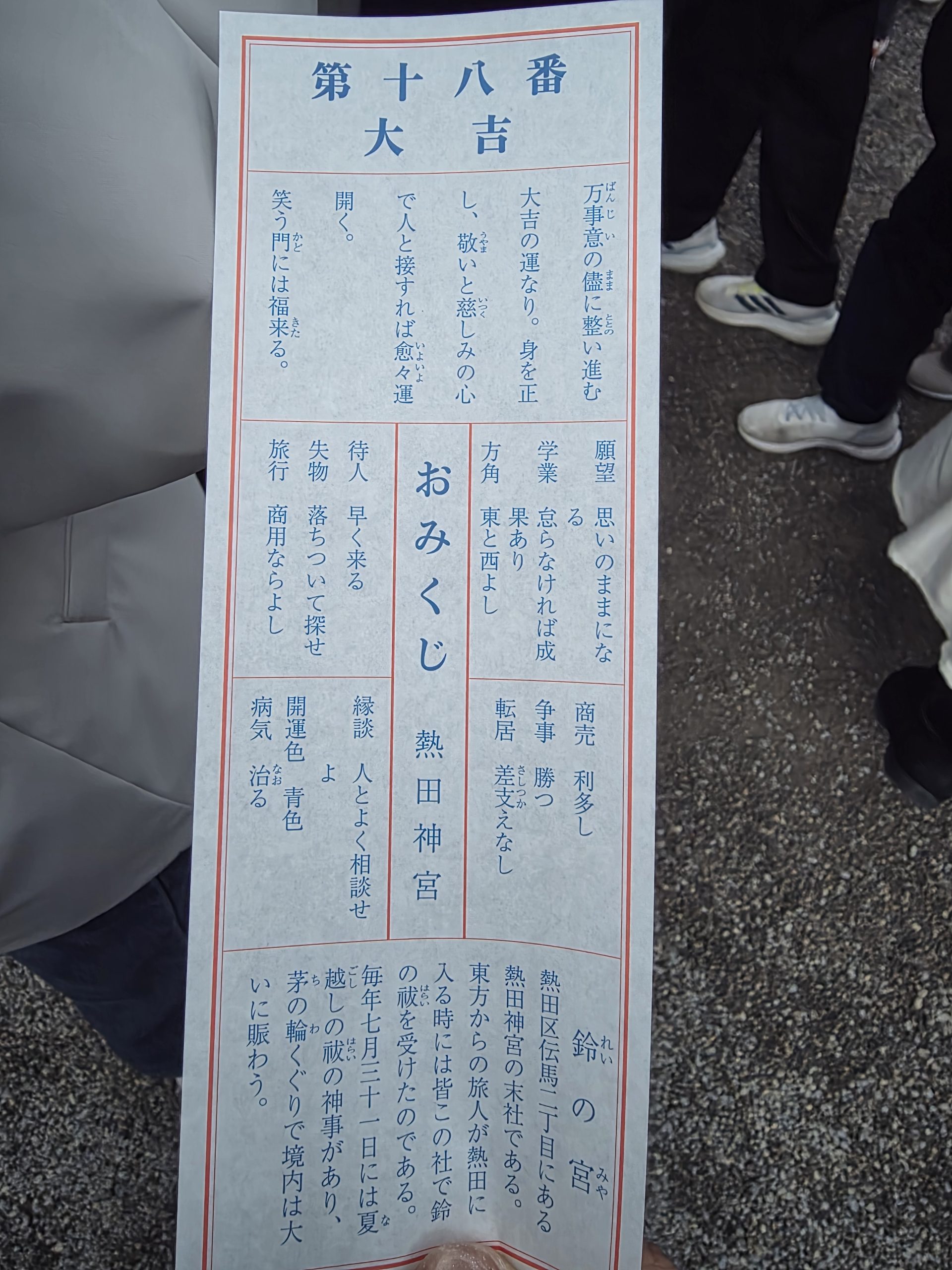 おみくじには「身を正し、人を敬い、誠実に進めば万事整う」とあり、